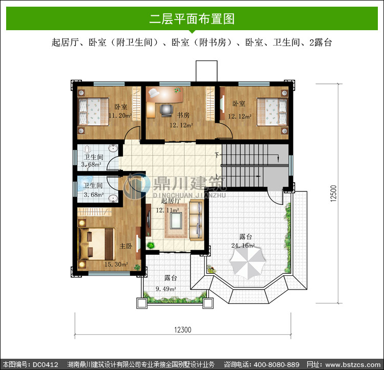 | 二 層: | 起居廳、主臥(附衛(wèi)生間)、臥室(附書(shū)房)、臥室、衛(wèi)生間、2露臺(tái) | |||