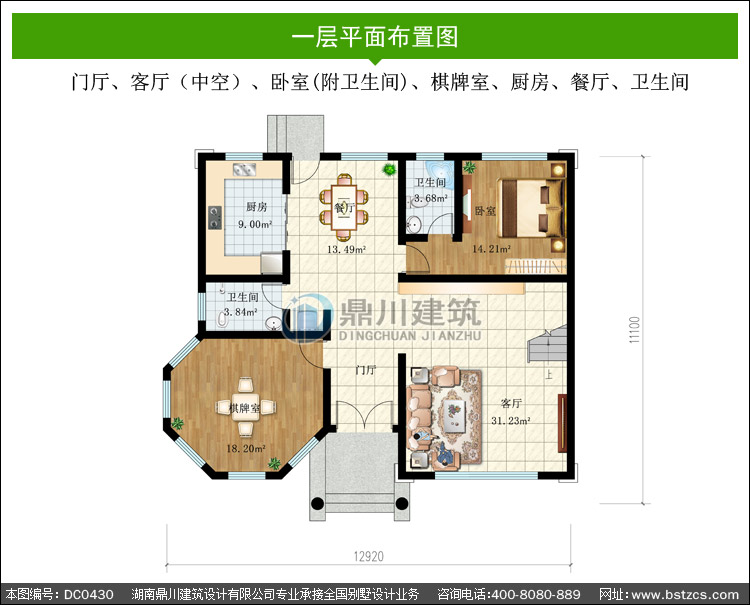 | 一 層: | 門廳、客廳(中空)、臥室(附衛(wèi)生間)、棋牌室、廚房、餐廳、衛(wèi)生間 | |||