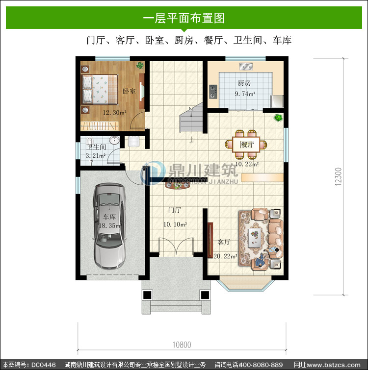 一 層: 門廳、客廳、臥室、廚房、餐廳、衛(wèi)生間、車庫(kù)