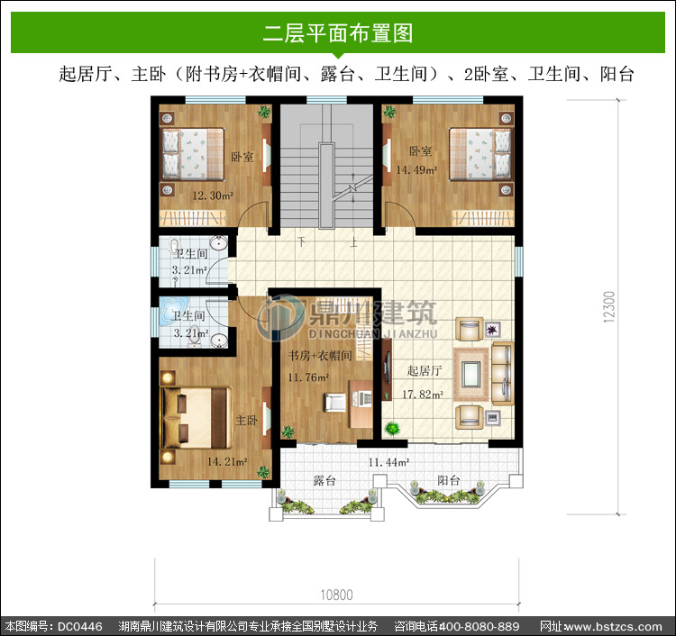 二 層: 起居廳、主臥(附書房+衣帽間、露臺(tái)、衛(wèi)生間)、2臥室、衛(wèi)生間、陽臺(tái)