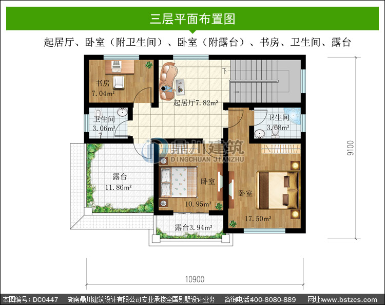 三 層: 起居廳、臥室(附衛(wèi)生間)、臥室(附露臺)、書房、衛(wèi)生間、露臺