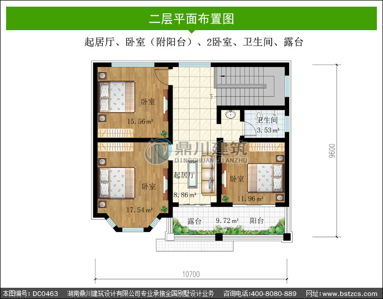 | 二 層: | 起居廳、臥室(附陽臺)、2臥室、衛(wèi)生間、露臺 | |||