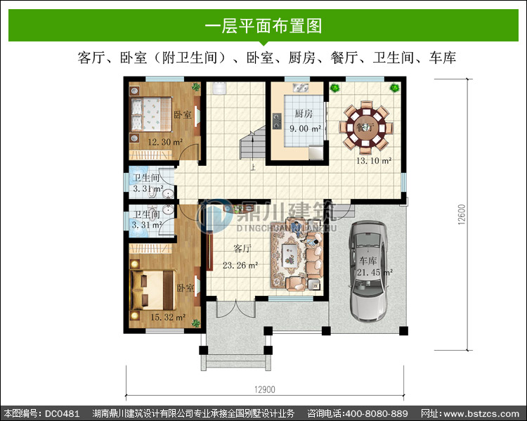 | 一 層: | 客廳、臥室(附衛(wèi)生間)、臥室、廚房、餐廳、衛(wèi)生間、車庫 | |||