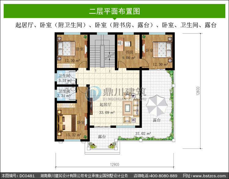 | 二 層: | 起居廳、臥室(附衛(wèi)生間)、臥室(附書房、露臺)、臥室、衛(wèi)生間、露臺 | |||