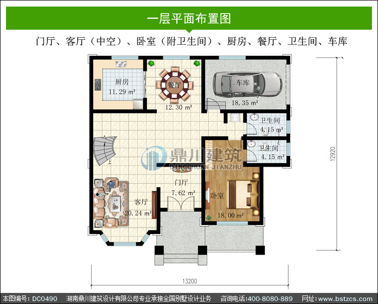 | 一 層: | 門廳、客廳(中空)、臥室(附衛(wèi)生間)、廚房、餐廳、衛(wèi)生間、車庫 | |||