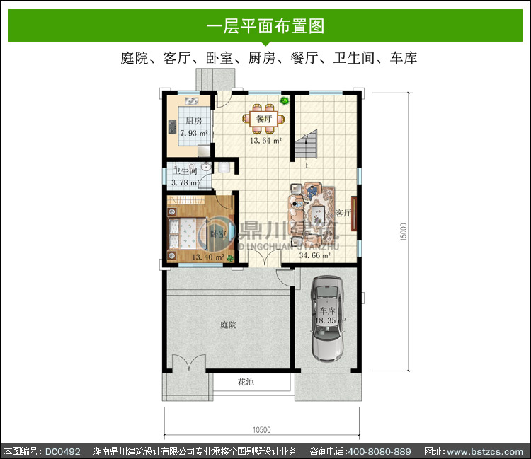 | 一 層: | 庭院、客廳、臥室、廚房、餐廳、衛(wèi)生間、車庫(kù) | |||