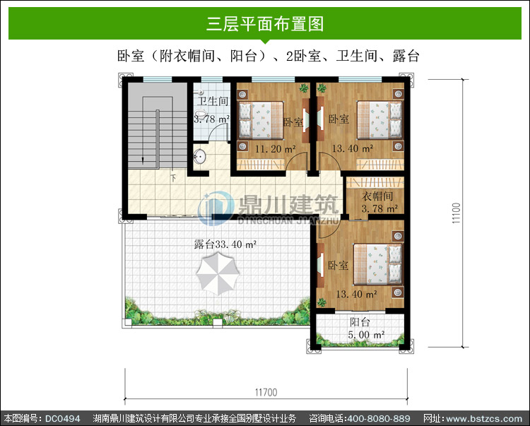 | 三 層: | 臥室(附衣帽間、陽臺)、2臥室、衛(wèi)生間、露臺 | |||