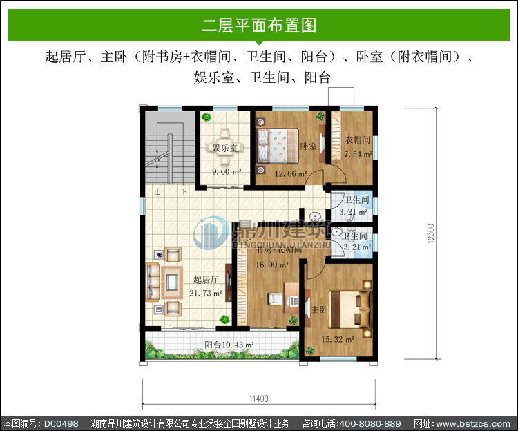 二 層: 起居廳、主臥(附書(shū)房+衣帽間、衛(wèi)生間、陽(yáng)臺(tái))、臥室(附衣帽間)、娛樂(lè) 室、衛(wèi)生間、陽(yáng)臺(tái)