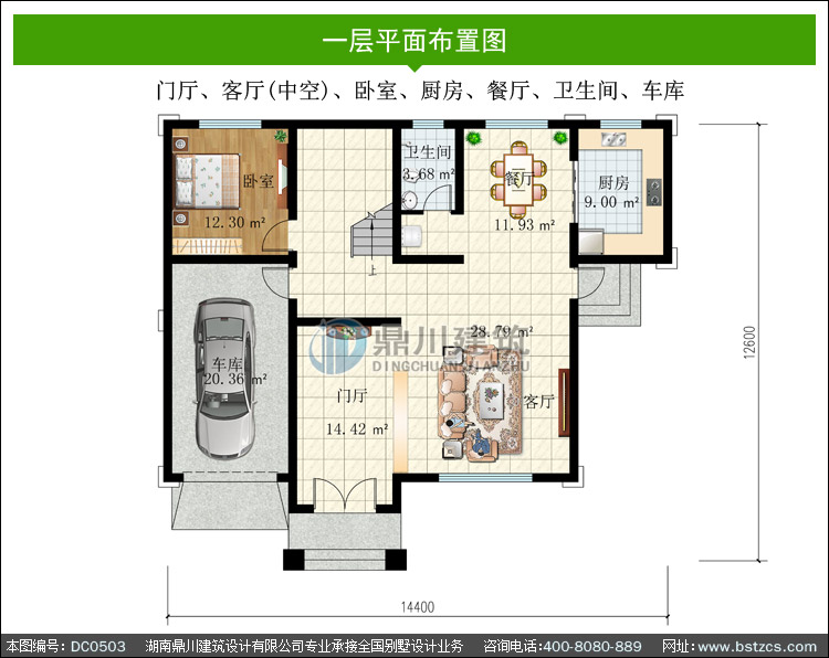 一 層: 門廳、客廳(中空)、臥室、廚房、餐廳、衛(wèi)生間、車庫