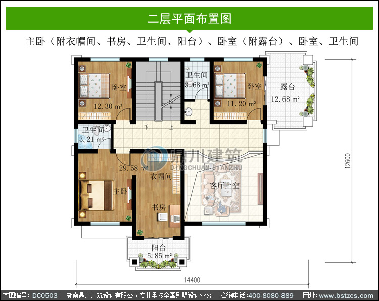 二 層: 主臥(附衣帽間、書房、衛(wèi)生間、陽臺)、臥室(附露臺)、臥室、衛(wèi)生間