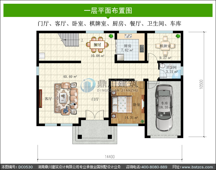 | 一 層: | 門廳、客廳、臥室、棋牌室、廚房、餐廳、衛(wèi)生間、車庫(kù) | |||
