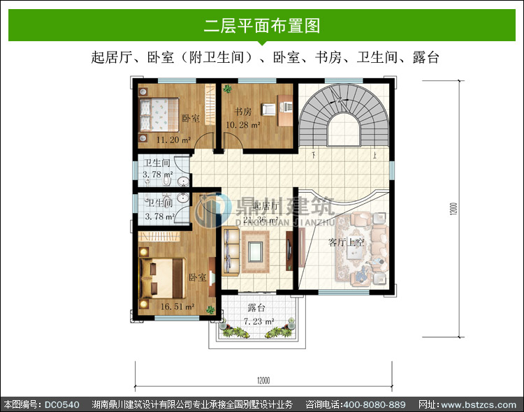 | 二 層: | 起居廳、臥室(附衛(wèi)生間)、臥室、書(shū)房、衛(wèi)生間、露臺(tái) | |||
