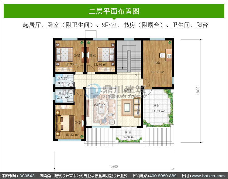 | 二 層: | 起居廳、臥室(附衛(wèi)生間)、2臥室、書房(附露臺)、衛(wèi)生間、陽臺 | |||