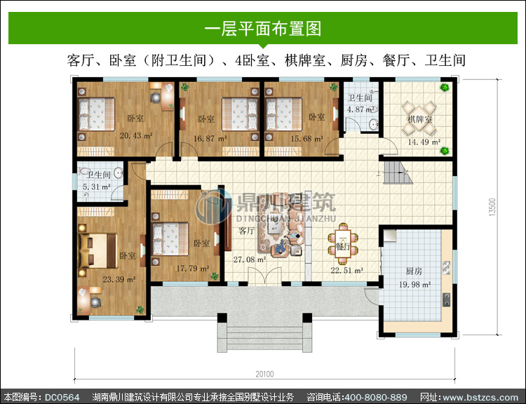 一 層: 客廳、臥室(附衛(wèi)生間)、4臥室、棋牌室、廚房、餐廳、衛(wèi)生間