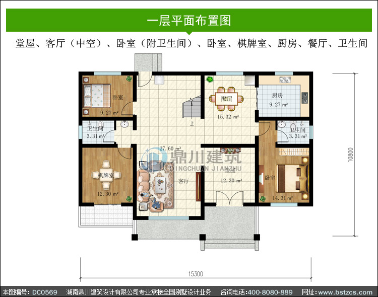 | 一 層: | 堂屋、客廳(中空)、臥室(附衛(wèi)生間)、臥室、棋牌室、廚房、餐廳、衛(wèi) 生間 | |||