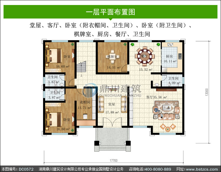 一 層: 堂屋、客廳、臥室(附衣帽間、衛(wèi)生間)、臥室(附衛(wèi)生間)、棋牌室、廚房、餐廳、衛(wèi)生間