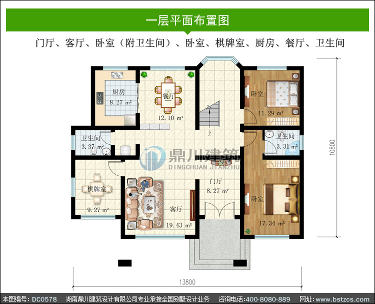 | 一 層: | 門廳、客廳、臥室(附衛(wèi)生間)、臥室、棋牌室、廚房、餐廳、衛(wèi)生間 | |||