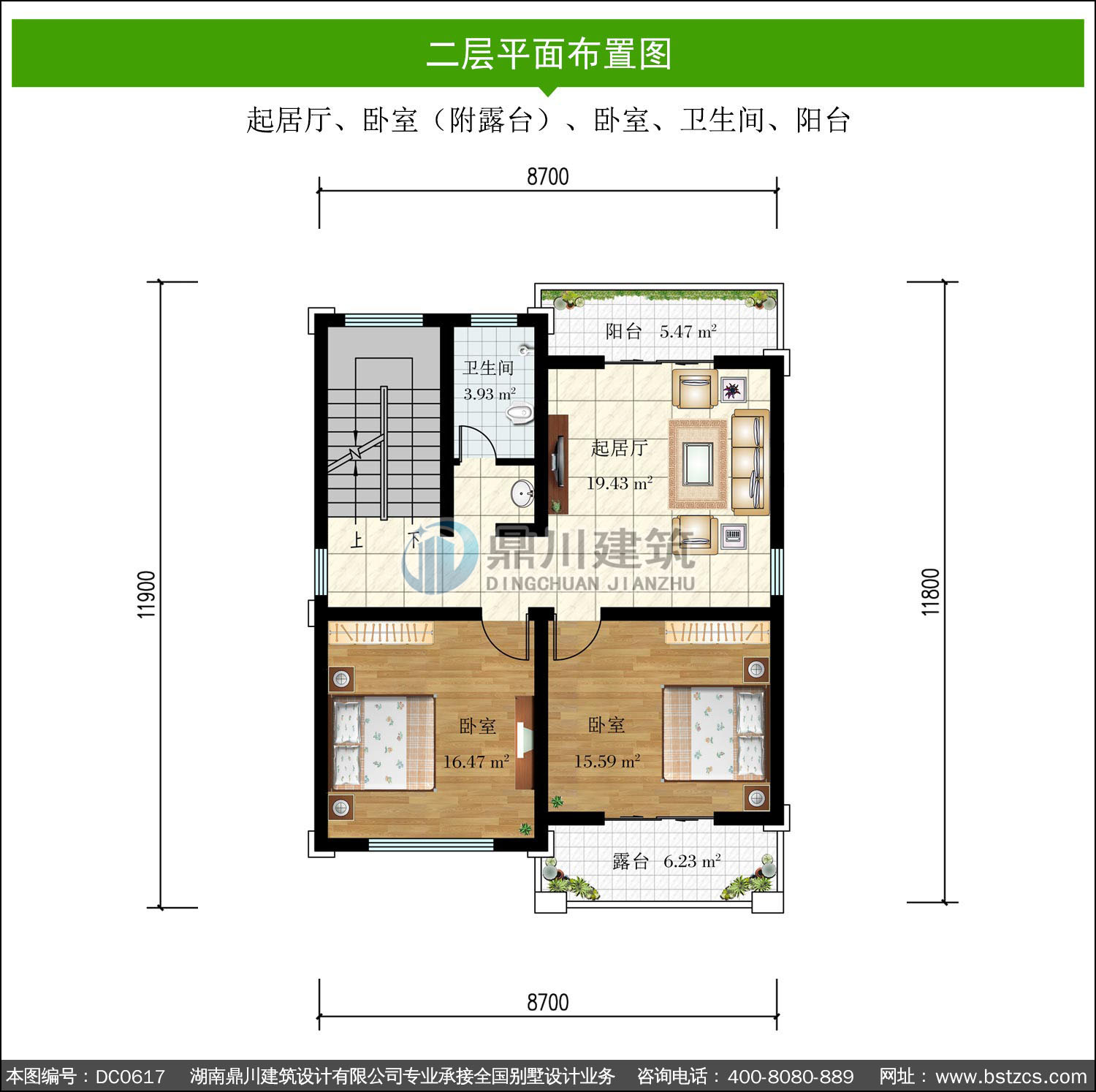 | 二 層: | 起居廳、臥室(附露臺)、臥室、衛(wèi)生間、陽臺 | |||