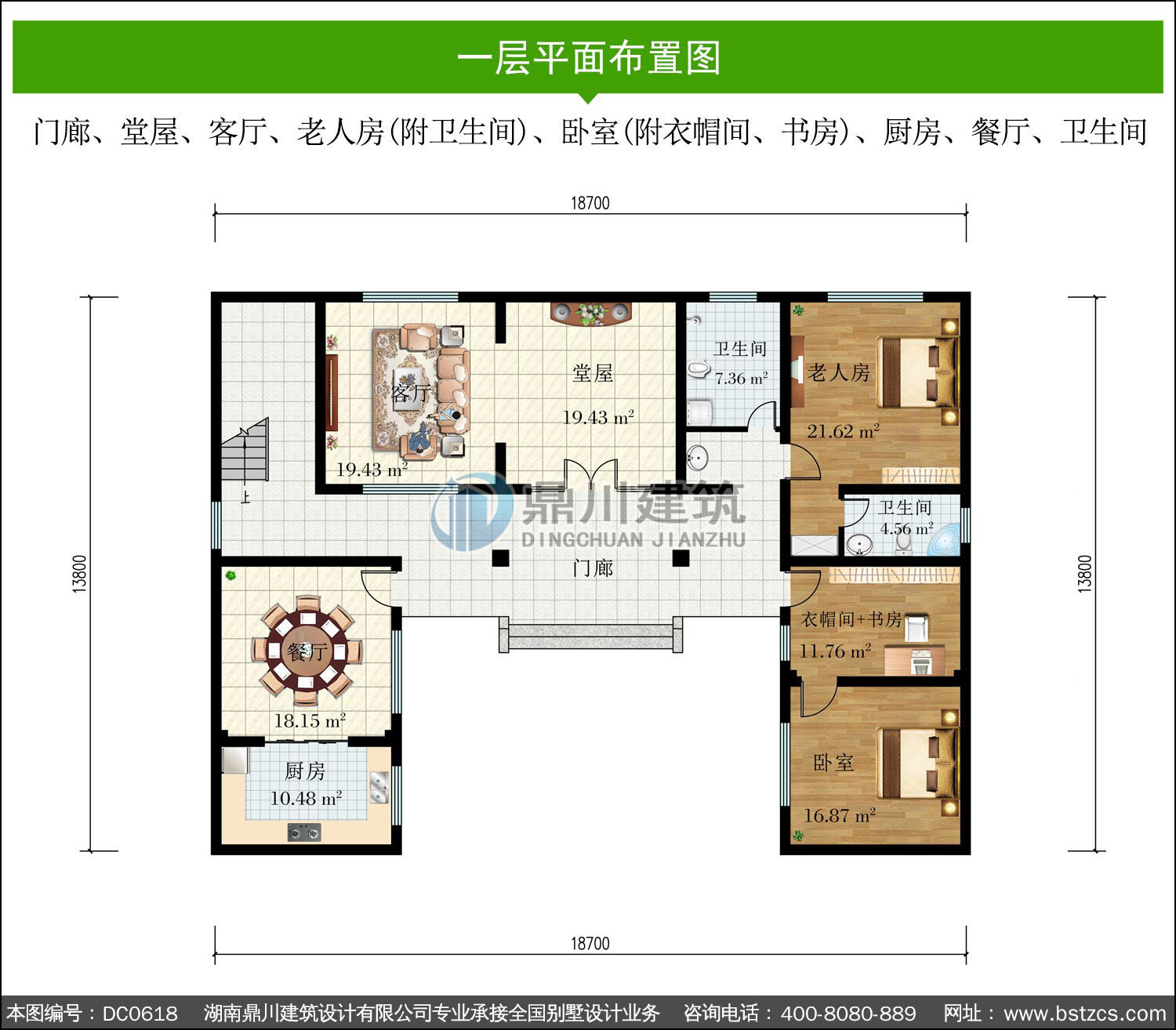| 一 層: | 門廊、堂屋、客廳、老人房(附衛(wèi)生間)、臥室(附衣帽間、書房)、廚房、餐廳、衛(wèi)生間 | |||