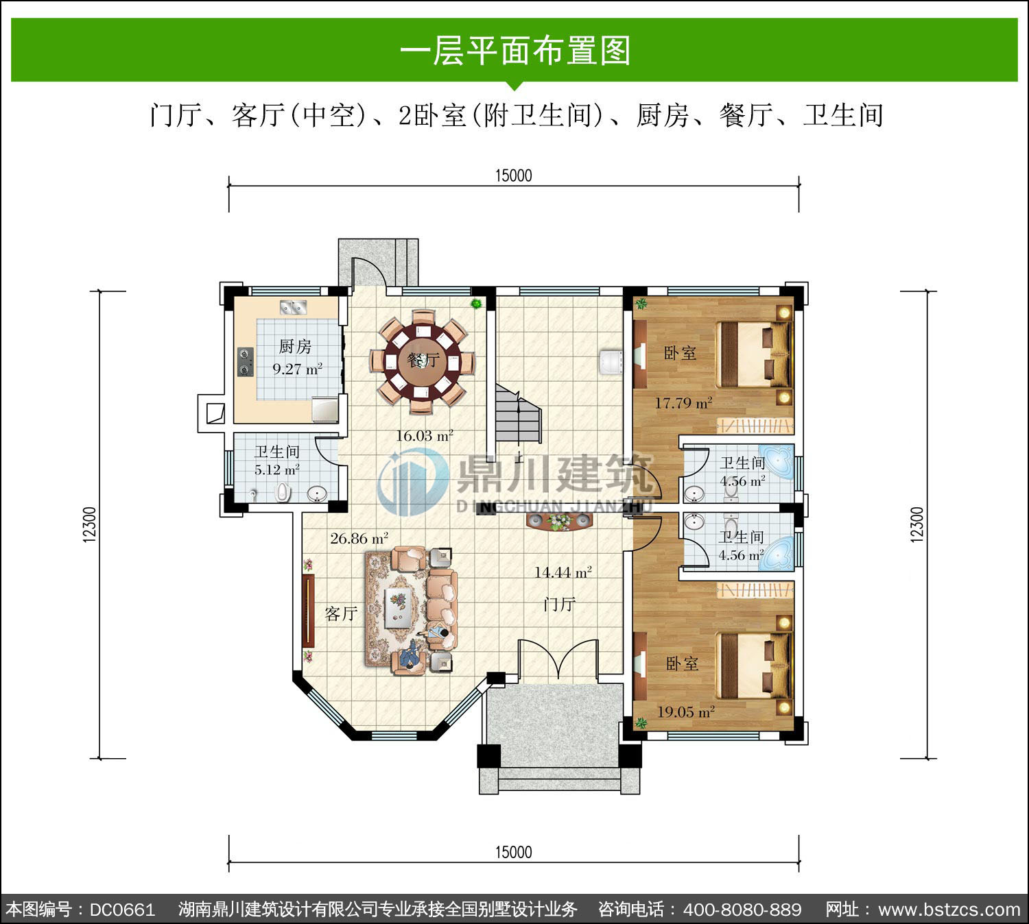 一 層: 門廳、客廳(中空)、2臥室(附衛(wèi)生間)、廚房、餐廳、衛(wèi)生間