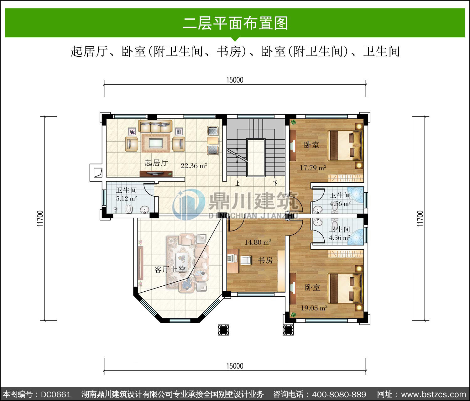 二 層: 起居廳、臥室(附衛(wèi)生間、書房)、臥室(附衛(wèi)生間)、衛(wèi)生間
