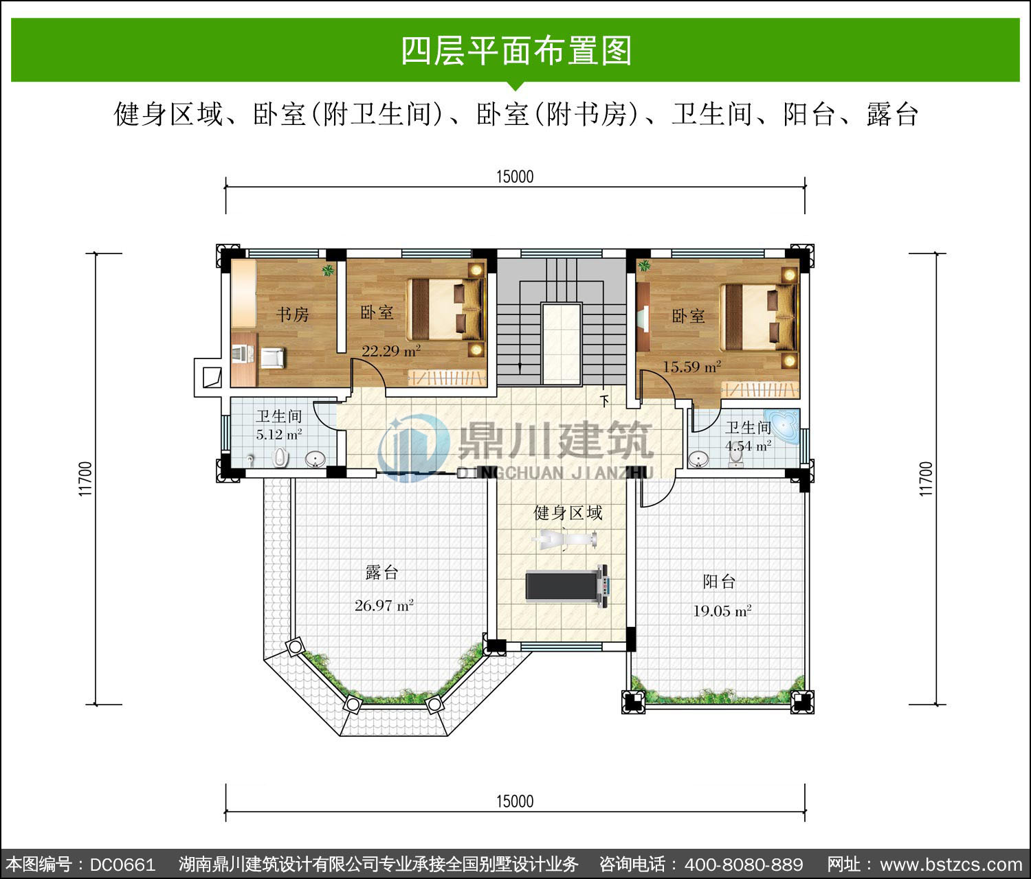 四 層: 健身區(qū)域、臥室(附衛(wèi)生間)、臥室(附書房)、衛(wèi)生間、陽臺、露臺