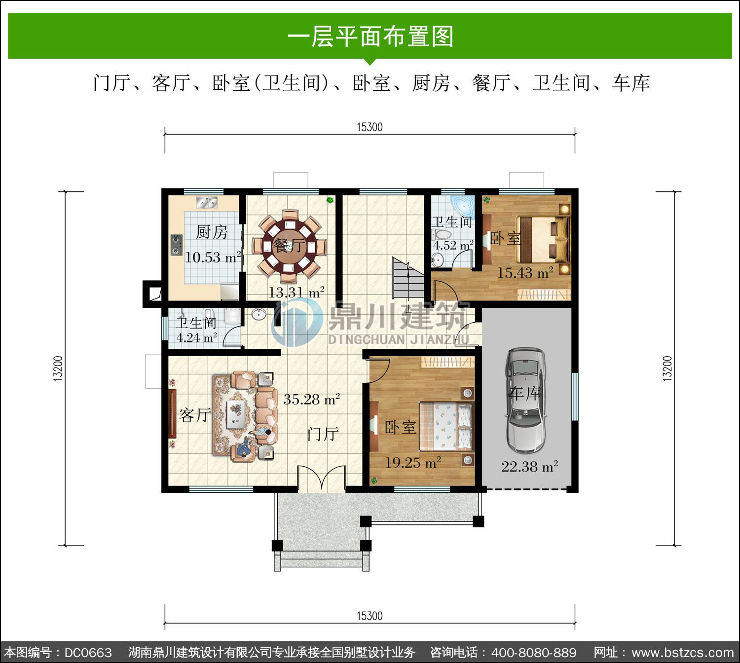 一 層: 門廳、客廳、臥室(衛(wèi)生間)、臥室、廚房、餐廳、衛(wèi)生間、車庫