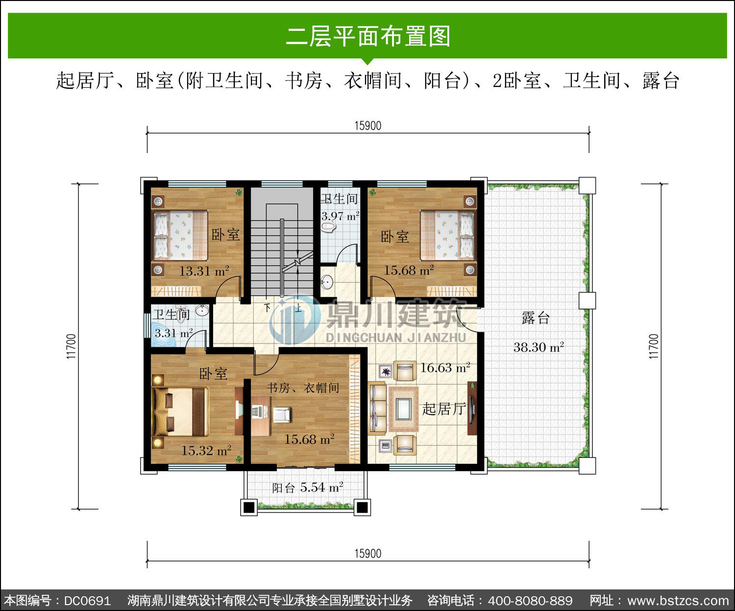 二 層: 起居廳、臥室(附衛(wèi)生間、書房、衣帽間、陽臺)、2臥室、衛(wèi)生間、露臺