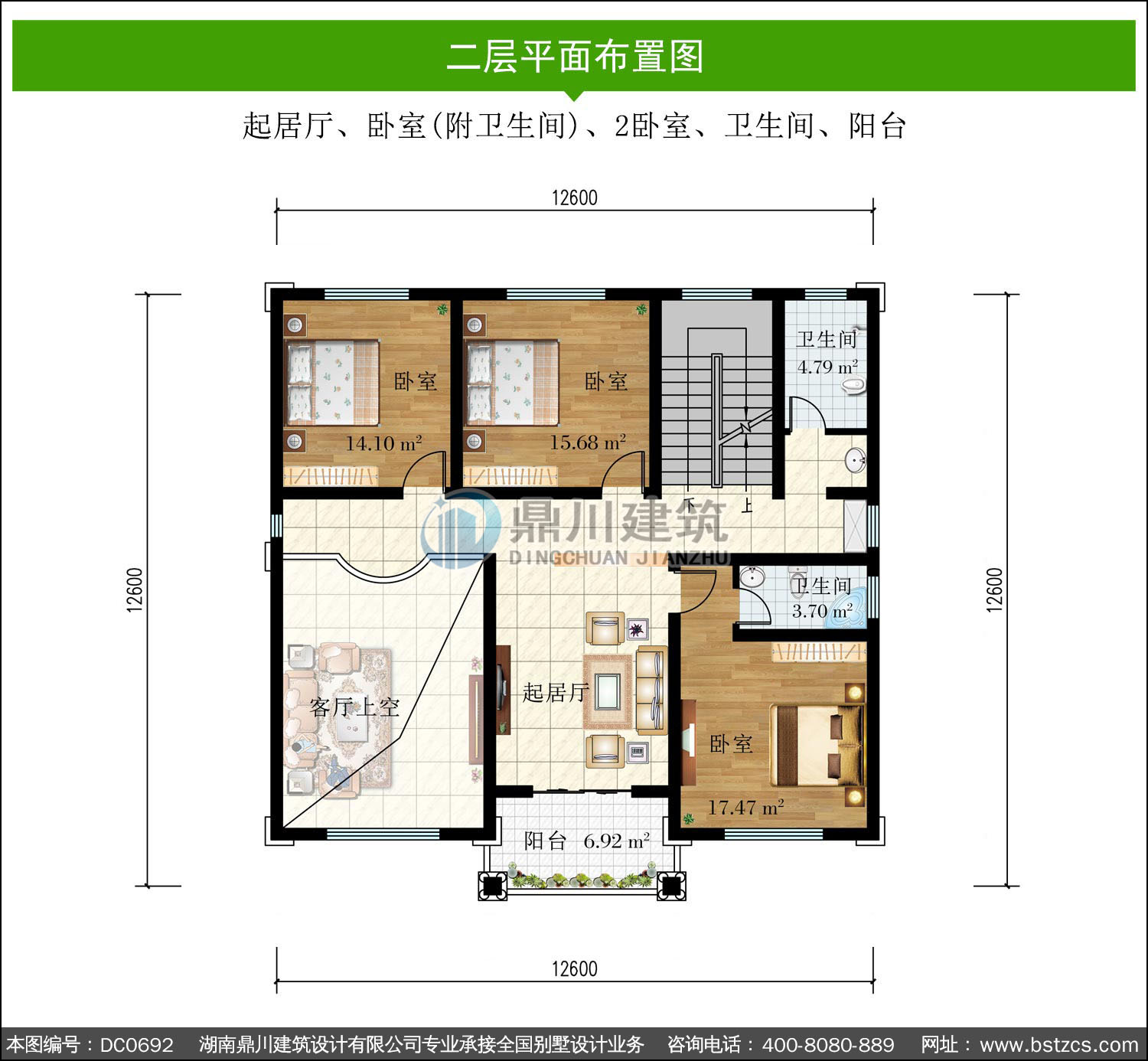 二 層: 起居廳、臥室(附衛(wèi)生間)、2臥室、衛(wèi)生間、陽臺