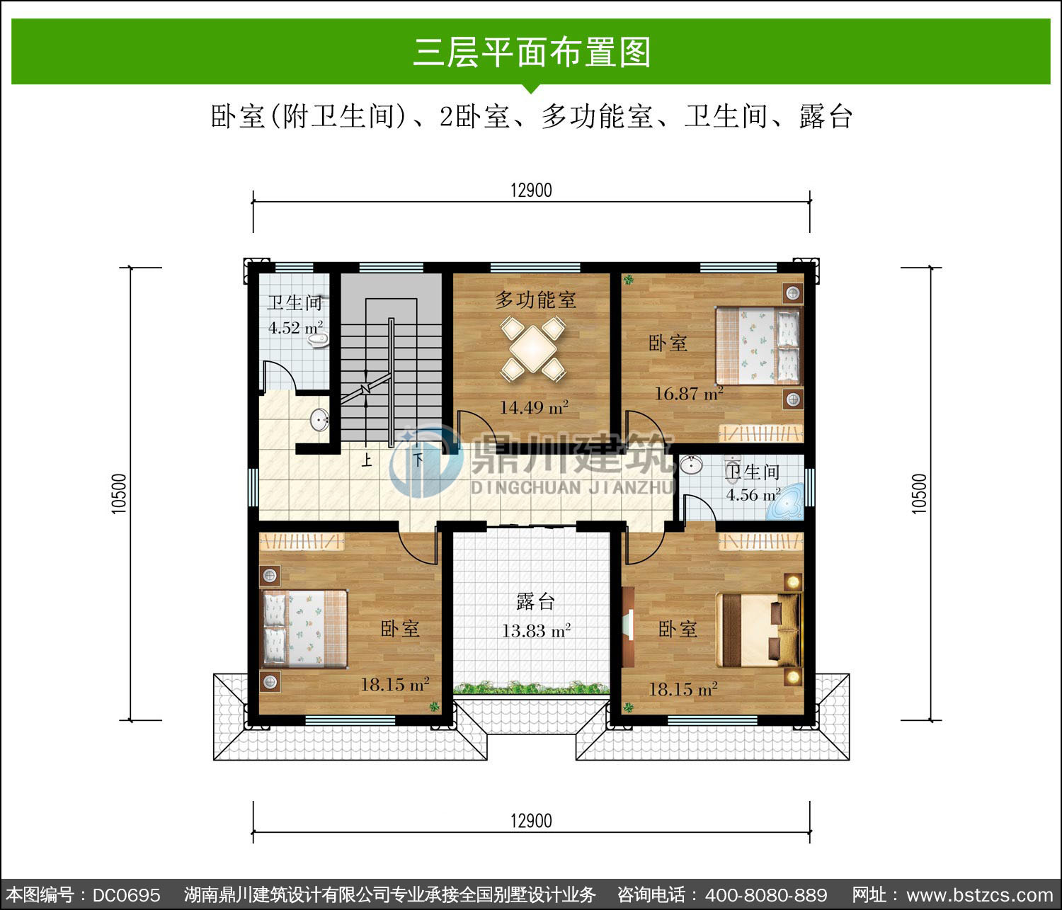 | 三 層: | 臥室(附衛(wèi)生間)、2臥室、多功能室、衛(wèi)生間、露臺(tái) | |||