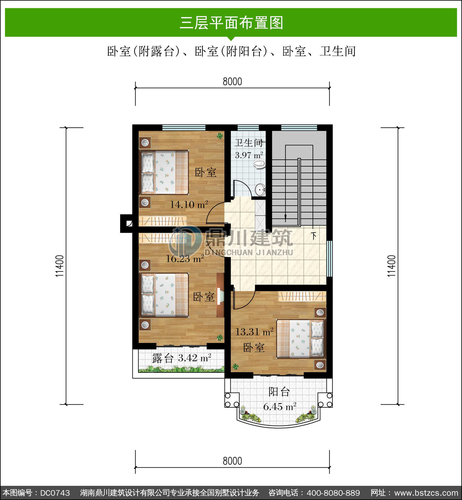 | 三 層: | 臥室(附露臺)、臥室(附陽臺)、臥室、衛(wèi)生間 | |||