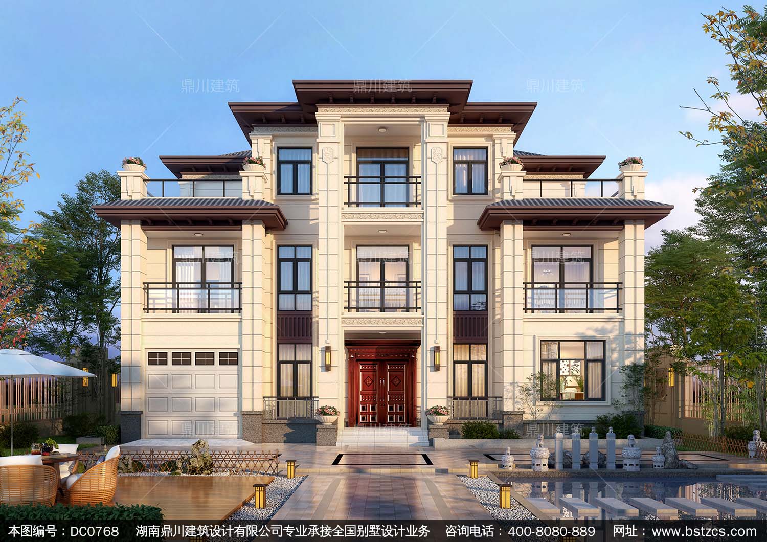 大氣的新中式三層帶車庫別墅圖紙及效果圖_農(nóng)村別墅設計,鼎川建筑
