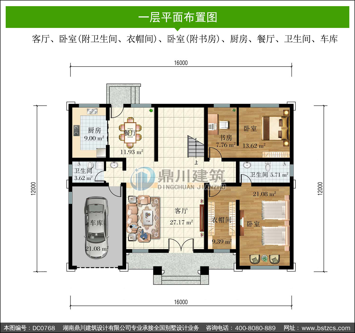 | 一 層: | 客廳、臥室(附衛(wèi)生間、衣帽間)、臥室(附書房)、廚房、餐廳、衛(wèi)生間、車庫 | |||