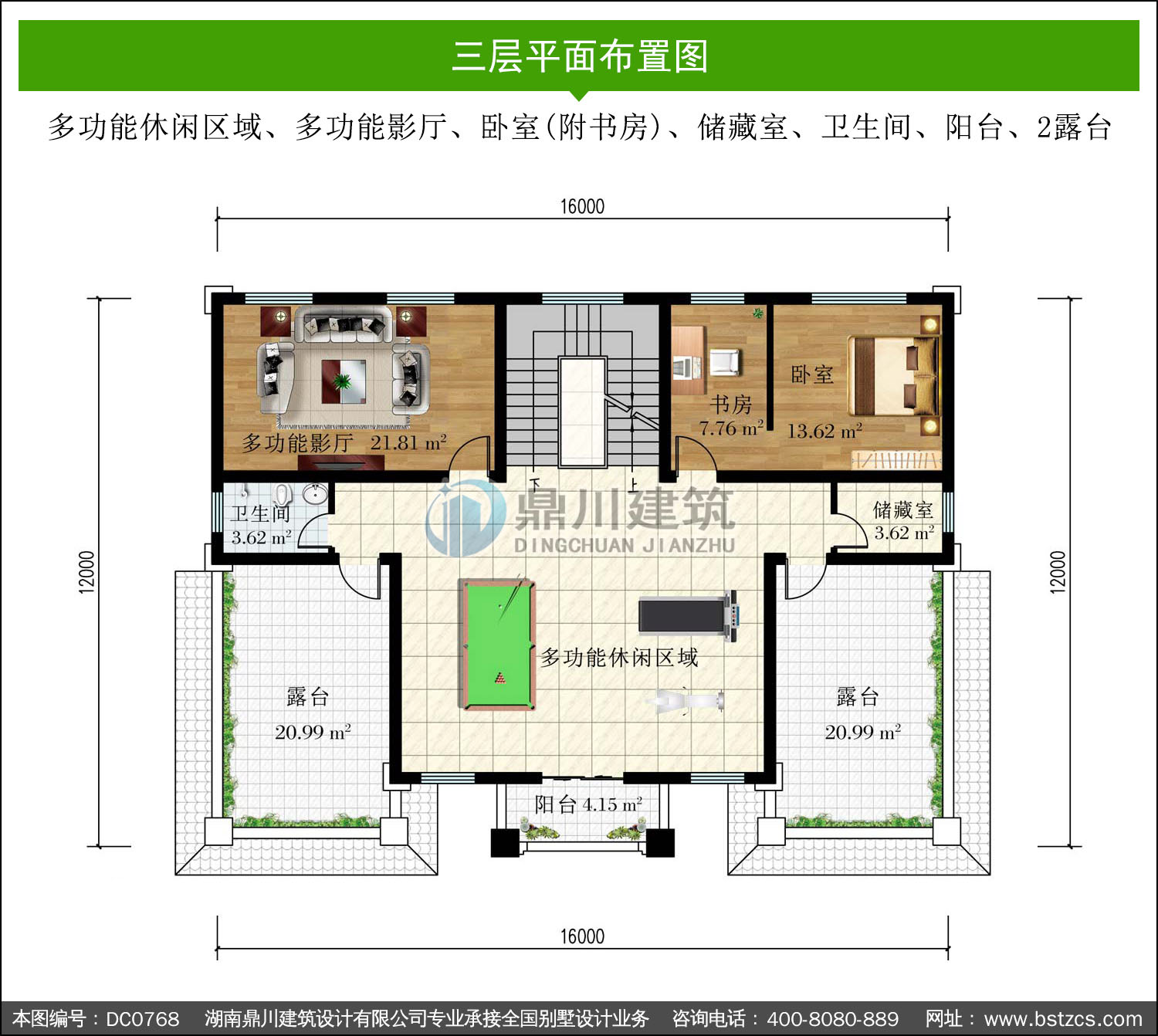 | 三 層: | 多功能休閑區(qū)域、多功能影廳、臥室(附書房)、儲藏室、衛(wèi)生間、陽臺、2露臺 | |||