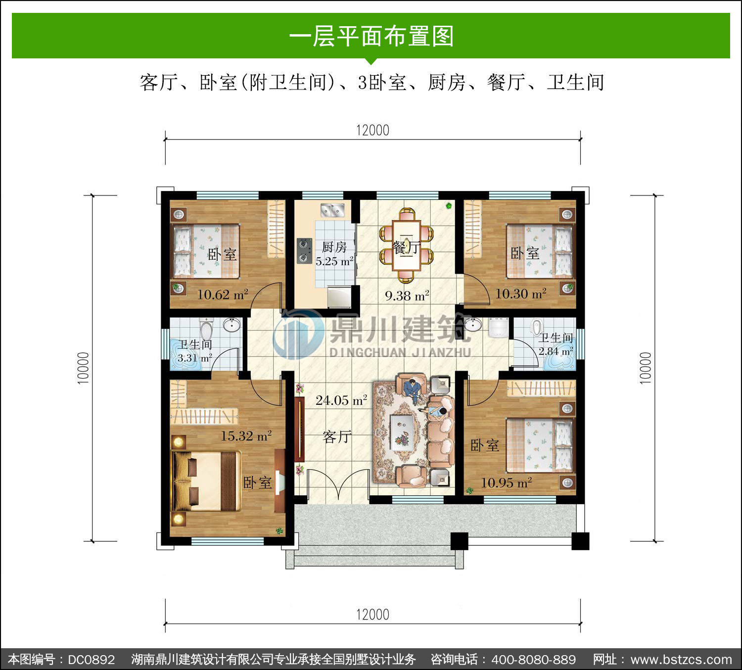 | 一 層: | 客廳、臥室(附衛(wèi)生間)、3臥室、廚房、餐廳、衛(wèi)生間 | |||