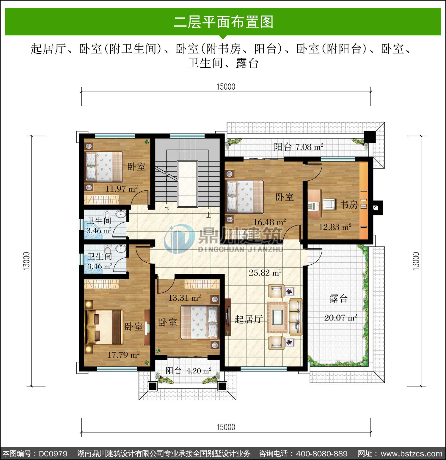| 二 層: | 起居廳、臥室(附衛(wèi)生間)、臥室(附書房、陽臺)、臥室(附陽臺)、臥室、衛(wèi)生間、露臺 | |||